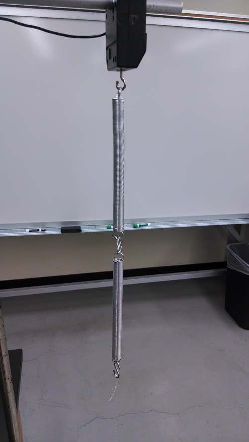 Use two springs to make a system of springs in series. Repeat steps 13 and 14 from Part 1. Be sure to take a screenshot of all graphs to upload in the Inlab for Part 2.
