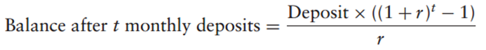 Here t is the number of deposits, and r is the monthly interest rate APR/12 expressed as a decimal.