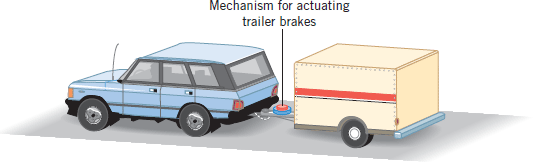 The physics of automatic trailer brakes. There is a clever application of Newton's third law in some rental trailers. As Figure 4.8 illustrates, the tow bar connecting the trailer to the rear bumper of a car contains a mechanism that can automatically actuate brakes on the trailer wheels. This mechanism works without the need for electrical connections between the car and the trailer. When the driver applies the car brakes, the car slows down. Because of inertia, however, the trailer continues to roll forward and begins pushing against the bumper. In reaction, the bumper pushes back on the tow bar. The reaction force is used by the mechanism in the tow bar to “push a brake pedal” for the trailer.