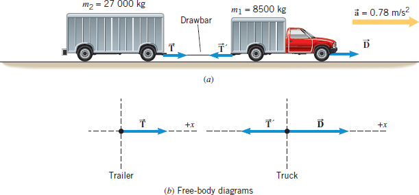 - (a)The free-body diagram for the trailer is shown in Figure 4.32b. There is only one horizontal force acting on the trailer, the tension force