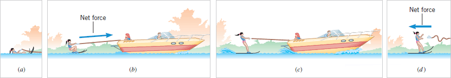 - (b)As the skier is being pulled up and out of the water, her velocity is increasing. Thus, she is accelerating, and the net force acting on her is not zero. The skier is not in equilibrium. The direction of the net force is shown in Figure 4.33b.