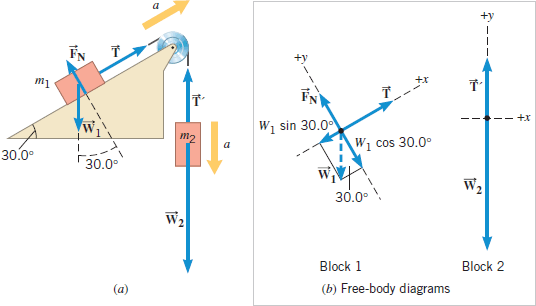 axis in the free-body diagram, consistent with the assumption that block 1 moves up the incline. Now there are two equations in two unknowns, and they may be solved simultaneously (see Appendix C) to give