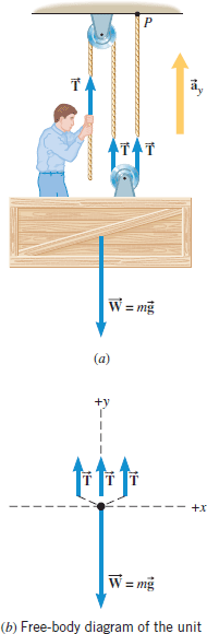 and is the magnitude of the tension in the rope. If the masses of the rope and each pulley are negligible and if the pulleys are friction-free, the tension is transmitted undiminished along the rope. Then, a 540-N tension force