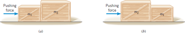 . The boxes are being pushed across a frictionless horizontal surface. As the drawing shows, there are two possible arrangements, and the pushing force is the same in each. In which arrangement,