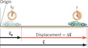 To describe the motion of an object, we must be able to specify the location of the object at all times, and Figure 2.1 shows how to do this for one-dimensional motion. In this drawing, the initial position of a car is indicated by the vector labeled . The length of is the distance of the car from an arbitrarily chosen origin. At a later time the car has moved to a new position, which is indicated by the vector . The displacement of the car (read as “delta x” or “the change in x”) is a vector drawn from the initial position to the final position. Displacement is a vector quantity in the sense discussed in Section 1.5, for it conveys both a magnitude (the distance between the initial and final positions) and a direction. The displacement can be related to and by noting from the drawing that
