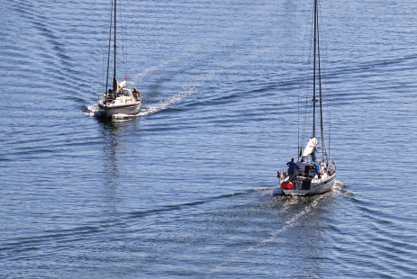 The boats in this photograph are traveling in opposite directions; in other words, the velocity of one boat points in a direction that is opposite to the velocity of the other boat. (© Michael Dietrick/age fotostock)