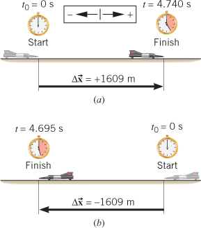 Andy Green in the car ThrustSSC set a world record of in 1997. The car was powered by two jet engines, and it was the first one officially to exceed the speed of sound. To establish such a record, the driver makes two runs through the course, one in each direction, to nullify wind effects. Figure 2.3a shows that the car first travels from left to right and covers a distance of (1 mile) in a time of . Figure 2.3b shows that in the reverse direction, the car covers the same distance in . From these data, determine the average velocity for each run.