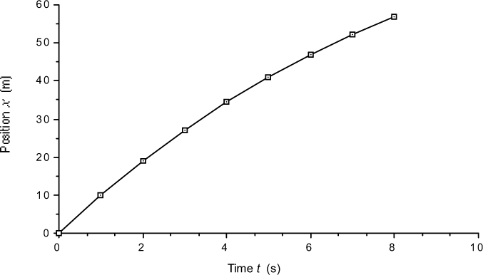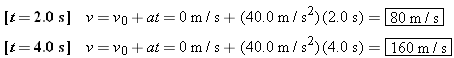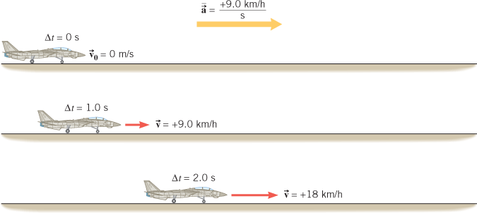 The average acceleration calculated in Example 3 is read as “nine kilometers per hour per second.” Assuming the acceleration of the plane is constant, a value of means the velocity changes by during each second of the motion. During the first second, the velocity increases from 0 to ; during the next second, the velocity increases by another to , and so on. Figure 2.5 illustrates how the velocity changes during the first two seconds. By the end of the 29th second, the velocity is .