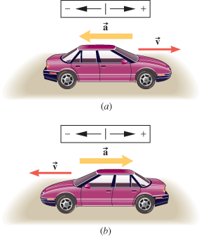 The average acceleration is a vector that points in the same direction as , the change in the velocity. Following the usual custom, plus and minus signs indicate the two possible directions for the acceleration vector when the motion is along a straight line.
