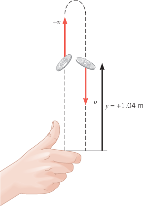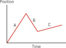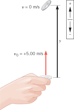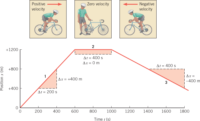 Average velocity is a vector that points in the same direction as the displacement in Equation 2.2. Figure 2.2 illustrates that the velocity of an object confined to move along a line can point either in one direction or in the opposite direction. As with displacement, we will use plus and minus signs to indicate the two possible directions. If the displacement points in the positive direction, the average velocity is positive. Conversely, if the displacement points in the negative direction, the average velocity is negative. Example 2 illustrates these features of average velocity.