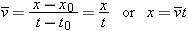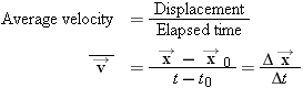 Note that is defined in a manner analogous to , which is the final position minus the initial position . Dividing the displacement of the car by the elapsed time gives the average velocity of the car. It is customary to denote the average value of a quantity by placing a horizontal bar above the symbol representing the quantity. The average velocity, then, is written as , as specified in Equation 2.2:
