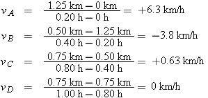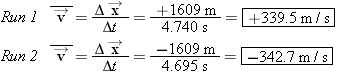 In these answers the algebraic signs convey the directions of the velocity vectors. In particular, for run 2 the minus sign indicates that the average velocity, like the displacement, points to the left in Figure 2.3b. The magnitudes of the velocities are 339.5 and . The average of these numbers is , and this is recorded in the record book.