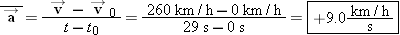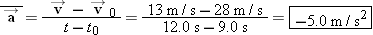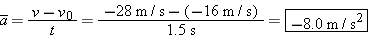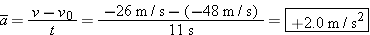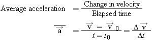 The average acceleration of the plane is defined as the change in its velocity divided by the elapsed time. The change in the plane's velocity is its final velocity minus its initial velocity , or . The elapsed time is the final time t minus the initial time , or .