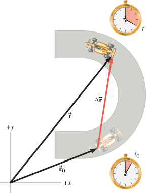 In Chapter 2 the concepts of displacement, velocity, and acceleration are used to describe an object moving in one dimension. There are also situations in which the motion is along a curved path that lies in a plane. Such two-dimensional motion can be described using the same concepts. In Grand Prix racing, for example, the course follows a curved road, and Figure 3.1 shows a race car at two different positions along it. These positions are identified by the vectors and , which are drawn from an arbitrary coordinate origin. The displacement of the car is the vector drawn from the initial position at time to the final position at time t. The magnitude of is the shortest distance between the two positions. In the drawing, the vectors and are drawn tail to head, so it is evident that is the vector sum of and . (See Sections 1.5 and 1.6 for a review of vectors and vector addition.) This means that , or