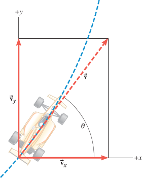 Figure 3.2 illustrates that the instantaneous velocity is tangent to the path of the car. The drawing also shows the vector components and of the velocity, which are parallel to the x and y axes, respectively.