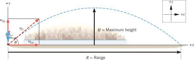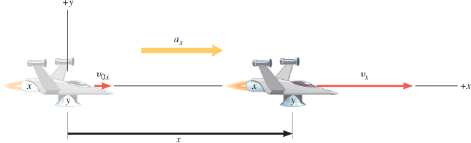 In Figure 3.3 only the engine oriented along the x direction is firing, and the vehicle accelerates along this direction. It is assumed that the velocity in the y direction is zero, and it remains zero, since the y engine is turned off. The motion of the spacecraft along the x direction is described by the five kinematic variables x, , , , and t. Here the symbol “x” reminds us that we are dealing with the x components of the displacement, velocity, and acceleration vectors. (See Sections 1.7 and 1.8 for a review of vector components.) The variables x, , , and are scalar components (or “components,” for short). As Section 1.7 discusses, these components are positive or negative numbers (with units), depending on whether the associated vector components point in the or the direction. If the spacecraft has a constant acceleration along the x direction, the motion is exactly like that described in Chapter 2, and the equations of kinematics can be used. For convenience, these equations are written in the left column of Table 3.1.