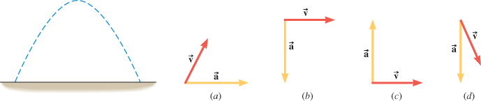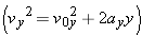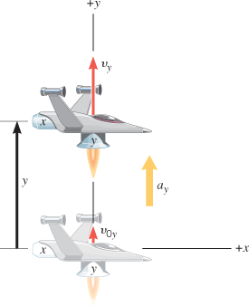 Figure 3.4 is analogous to Figure 3.3, except that now only the y engine is firing, and the spacecraft accelerates along the y direction. Such a motion can be described in terms of the kinematic variables y, , , , and t. And if the acceleration along the y direction is constant, these variables are related by the equations of kinematics, as written in the right column of Table 3.1. Like their counterparts in the x direction, the scalar components, y, , , and , may be positive or negative numbers (with units).