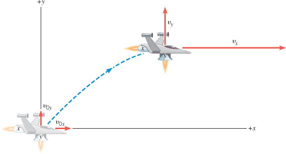 If both engines of the spacecraft are firing at the same time, the resulting motion takes place in part along the x axis and in part along the y axis, as Figure 3.5 illustrates. The thrust of each engine gives the vehicle a corresponding acceleration component. The x engine accelerates the craft in the x direction and causes a change in the x component of the velocity. Likewise, the y engine causes a change in the y component of the velocity. In other words, the x and y motions are independent of each other.