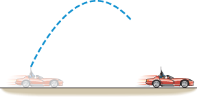 In a stunt being filmed for a movie, a sports car overtakes a truck towing a ramp, drives up and off the ramp, soars into the air, and then lands on top of a flat trailer being towed by a second truck. The tops of the ramp and the flat trailer are the same height above the road, and the ramp is inclined above the horizontal. Both trucks are driving at a constant speed of , and the flat trailer is 15 m from the end of the ramp. Neglect air resistance, and assume that the ramp changes the direction, but not the magnitude, of the car's initial velocity. What is the minimum speed the car must have, relative to the road, as it starts up the ramp?