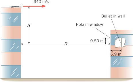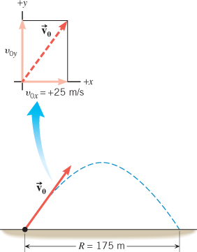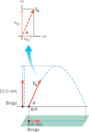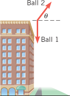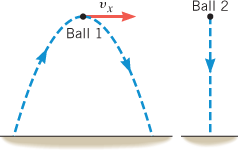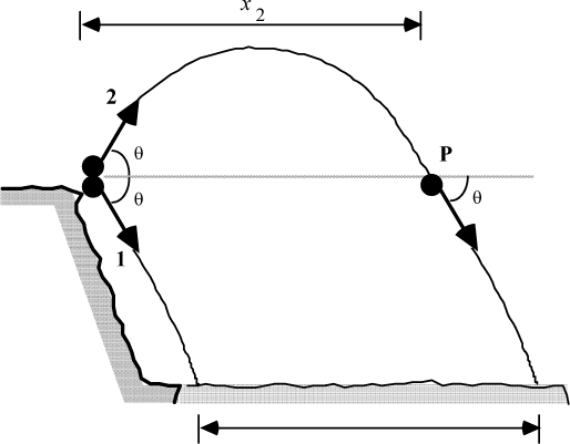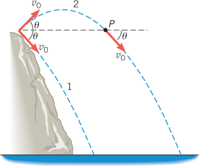REASONING The horizontal distance covered by stone 1 is equal to the distance covered by stone 2 after it passes point P in the following diagram. Thus, the distance between the points where the stones strike the ground is equal to , the horizontal distance covered by stone 2 when it reaches P. In the diagram, we assume up and to the right are positive.