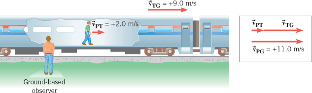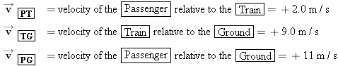 The velocity of the passenger relative to the shore is related to and by (see the method of subscripting discussed in Section 3.4):