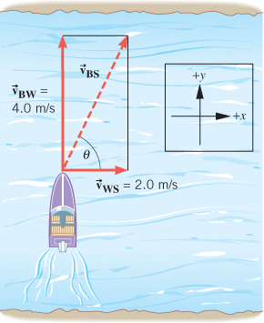 REASONING The velocity of the puck relative to Mario is the vector sum of the velocity of the puck relative to the ice and the velocity of the ice relative to Mario as indicated by Equation 3.7: . The values of and are given in the statement of the problem. In order to use the data, we must make use of the fact that , with the result that .