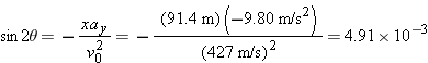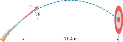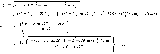 A placekicker is about to kick a field goal. The ball is 26.9 m from the goalpost. The ball is kicked with an initial velocity of at an angle above the ground. Between what two angles, and , will the ball clear the 2.74-m-high crossbar?