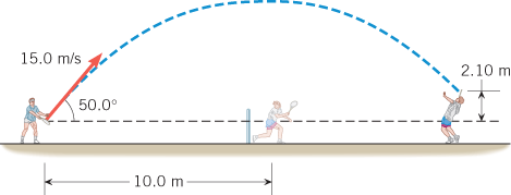 The lob in tennis is an effective tactic when your opponent is near the net. It consists of lofting the ball over his head, forcing him to move quickly away from the net (see the drawing). Suppose that you lob the ball with an initial speed of , at an angle of above the horizontal. At this instant your opponent is 10.0 m away from the ball. He begins moving away from you 0.30 s later, hoping to reach the ball and hit it back at the moment that it is 2.10 m above its launch point. With what minimum average speed must he move? (Ignore the fact that he can stretch, so that his racket can reach the ball before he does.)