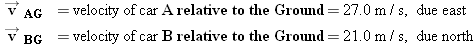 REASONING The velocity of train A relative to train B is the vector sum of the velocity of train A relative to the ground and the velocity of the ground relative to train B, as indicated by Equation 3.7: . The values of and are given in the statement of the problem. We must also make use of the fact that .