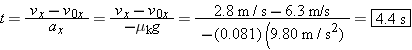 4.4 s REASONING Let us assume that the skater is moving horizontally along the axis. The time it takes for the skater to reduce her velocity to from can be obtained from one of the equations of kinematics:
