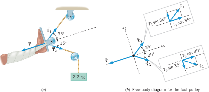 b shows the free-body diagram of the pulley on the foot. The