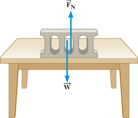 If an object is resting on a horizontal surface and there are no vertically acting forces except the object's weight and the normal force, the magnitudes of these two forces are equal; that is, . This is the situation in Figure 4.13. The weight must be balanced by the normal force for the object to remain at rest on the table. If the magnitudes of these forces were not equal, there would be a net force acting on the block, and the block would accelerate either upward or downward, in accord with Newton's second law.