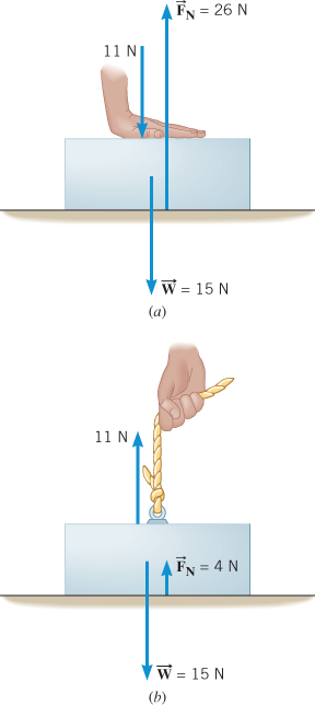 If other forces in addition to and act in the vertical direction, the magnitudes of the normal force and the weight are no longer equal. In Figure 4.14a, for instance, a box whose weight is 15 N is being pushed downward against a table. The pushing force has a magnitude of 11 N. Thus, the total downward force exerted on the box is 26 N, and this must be balanced by the upward-acting normal force if the box is to remain at rest. In this situation, then, the normal force is 26 N, which is considerably larger than the weight of the box.