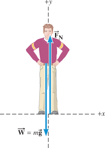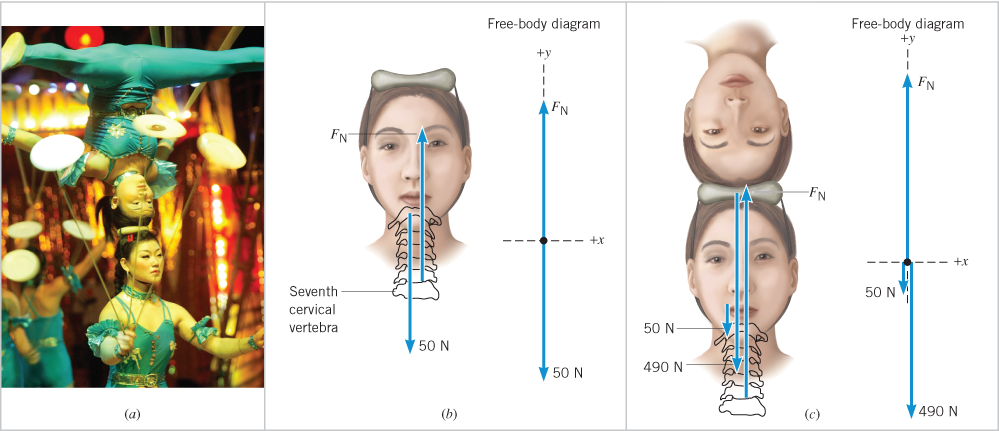 Figure 4.15b shows the free-body diagram for the standing performer's head and neck before the act. The only forces acting are the normal force and the 50-N weight. These two forces must balance for the standing performer's head and neck to remain at rest. Therefore, the seventh cervical vertebra exerts a normal force of .