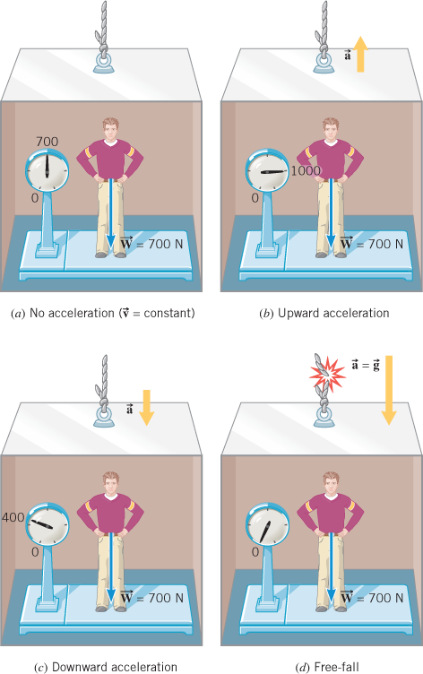 Equation 4.6 contains all the features shown in Figure 4.16. If the elevator is not accelerating, , and the apparent weight equals the true weight. If the elevator accelerates upward, a is positive, and the equation shows that the apparent weight is greater than the true weight. If the elevator accelerates downward, a is negative, and the apparent weight is less than the true weight. If the elevator falls freely, , and the apparent weight is zero. The apparent weight is zero because when both the person and the scale fall freely, they cannot push against one another. In this text, when the weight is given, it is assumed to be the true weight, unless stated otherwise.