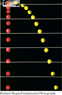 4-10 is a stroboscopic photograph of two golf balls, one simply released and the other shot horizontally by a spring. The golf