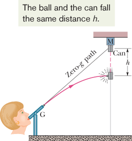 4-11, a blowgun G using a ball as a projectile is aimed directly at a can suspended from a magnet M. Just as the ball leaves the