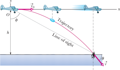 Here we know that  because the origin is placed at the point of release. Because the capsule is released and not shot from the plane, its initial velocity  is equal to the plane's velocity. Thus, we know also that the initial velocity has magnitude  and angle  (measured relative to the positive direction of the x axis). However, we do not know the time t the capsule takes to move from the plane to the victim.