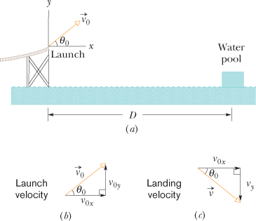 the velocity with which the man would have hit the water. Figure 4-15a indicates the launch and landing sites and includes a superimposed coordinate system with its origin conveniently located