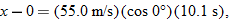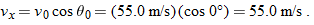 Because we know the horizontal displacement  , let's start with the horizontal motion. Since  , we know that the horizontal velocity component vx is constant during the flight and thus is always equal to the horizontal component  at launch. We can relate that component, the displacement  , and the flight time  with Eq. 2-15: