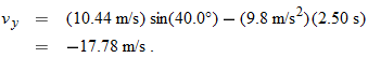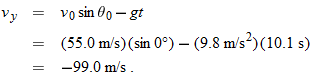 Now let's go after the magnitude v of the landing velocity. We already know the horizontal component, which does not change from its initial value of  . To find the vertical component vy and because we know the elapsed time  and the vertical acceleration  , let's rewrite Eq. 2-11 as
