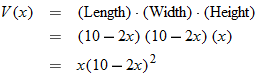 inches out of each corner and folding the sides up. Express the volume of the box as a function of , and state the domain. |
