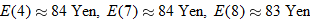 Approximate the exchange rates of the U.S. dollar to the nearest yen during Weeks 4, 7, and 8.