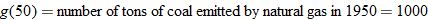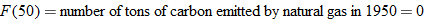 represent the number of tons of carbon emitted per year as a function of year corresponding to cement production, natural gas, coal, petroleum, and the total amount, respectively. Let
