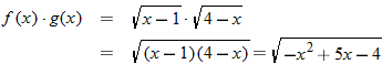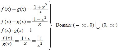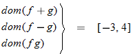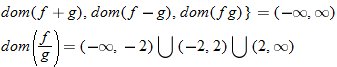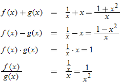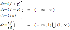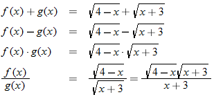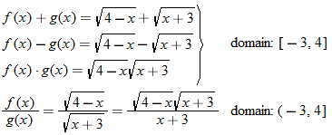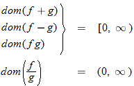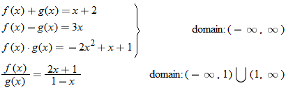 For the functions  and  , determine the sum function, difference function, product function, and quotient function. State the domain of these four new functions.