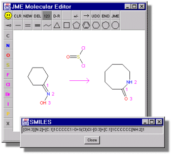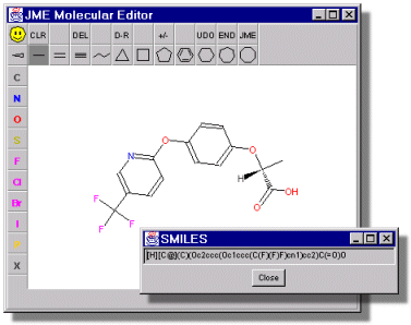 JME Molecular Editor © is a Java program which allows to draw, edit, and display molecules and reactions in a stand-alone mode or as an applet directly within an HTML page. The Editor can generate SMILES of created structure, so it can be used as a front-end to molecular and reaction databases or property calculation services.