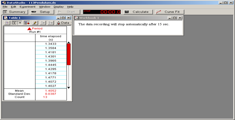 Allow the mass to swing back and forth a couple of times before you start making measurements to let the pendulum "settle." To start the data acquisition, press the Start button on the tool bar menu. Use small amplitudes (angles) of about 5°.1