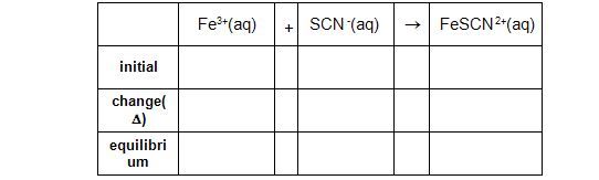 In Part A of this experiment, you will prepare FeSCN2+ solutions of known concentrations, measure their absorbance at 470 nm, and produce a calibration curve. In Part B, you will make equilibrium mixtures of Fe3+, SCN-, and FeSCN2+. You will determine the concentration of FeSCN2+ from its absorbance at 470 nm and your calibration curve from Part A. Then, using reaction tables, you will calculate the equilibrium concentrations of Fe3+ and SCN- and use those values to determine the equilibrium constant for the formation of FeSCN2+. You will calculate the equilibrium constant for each mixture you prepare and then use each value to find the average equilibrium constant for the formation of FeSCN2+.