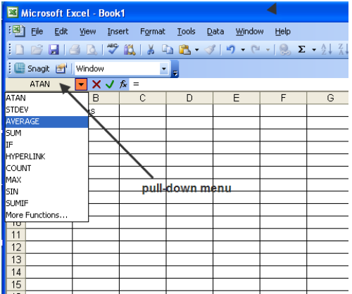 2In cell A8 type = and select AVERAGE from the pull-down menu, (see Fig. 2 below).