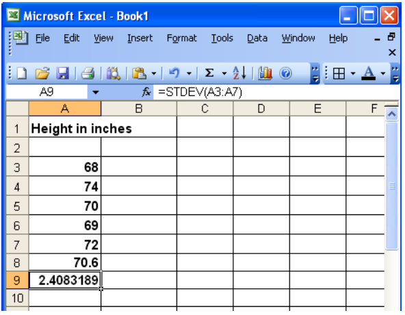 1Enter the readings in the first column. In this example, the values entered in cells A3 to A7 are the height (in inches) of five students (see Fig. 1 below).